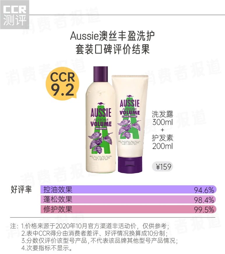 结果显示,这款Aussie澳丝丰盈洗护CCR评分为9.2分,在控油效果、蓬松效果上都得到超过90%的好评。