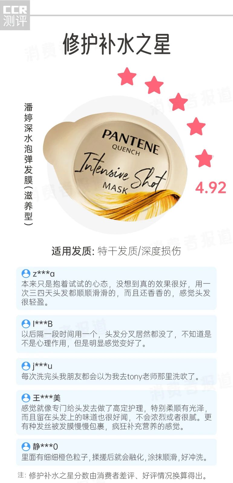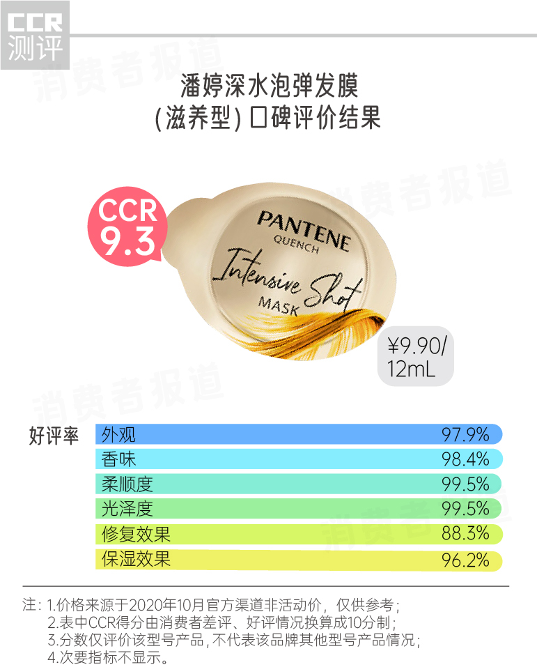 口碑评价结果显示,潘婷深水泡弹发膜(滋养型)CCR得分9.3分,其中柔顺度和光泽度的好评率一致高达99.5%,其次香味、外观、保湿效果等指标亦表现不俗。