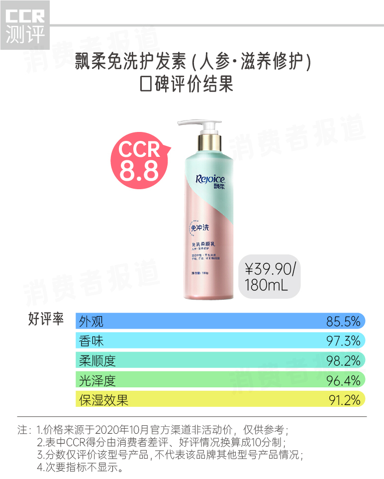 口碑评价结果显示,飘柔免洗护发素(人参·滋养修护)CCR得分8.8分,其在香味、柔顺度、光泽度指标中拥有的好评率均在95%以上。
