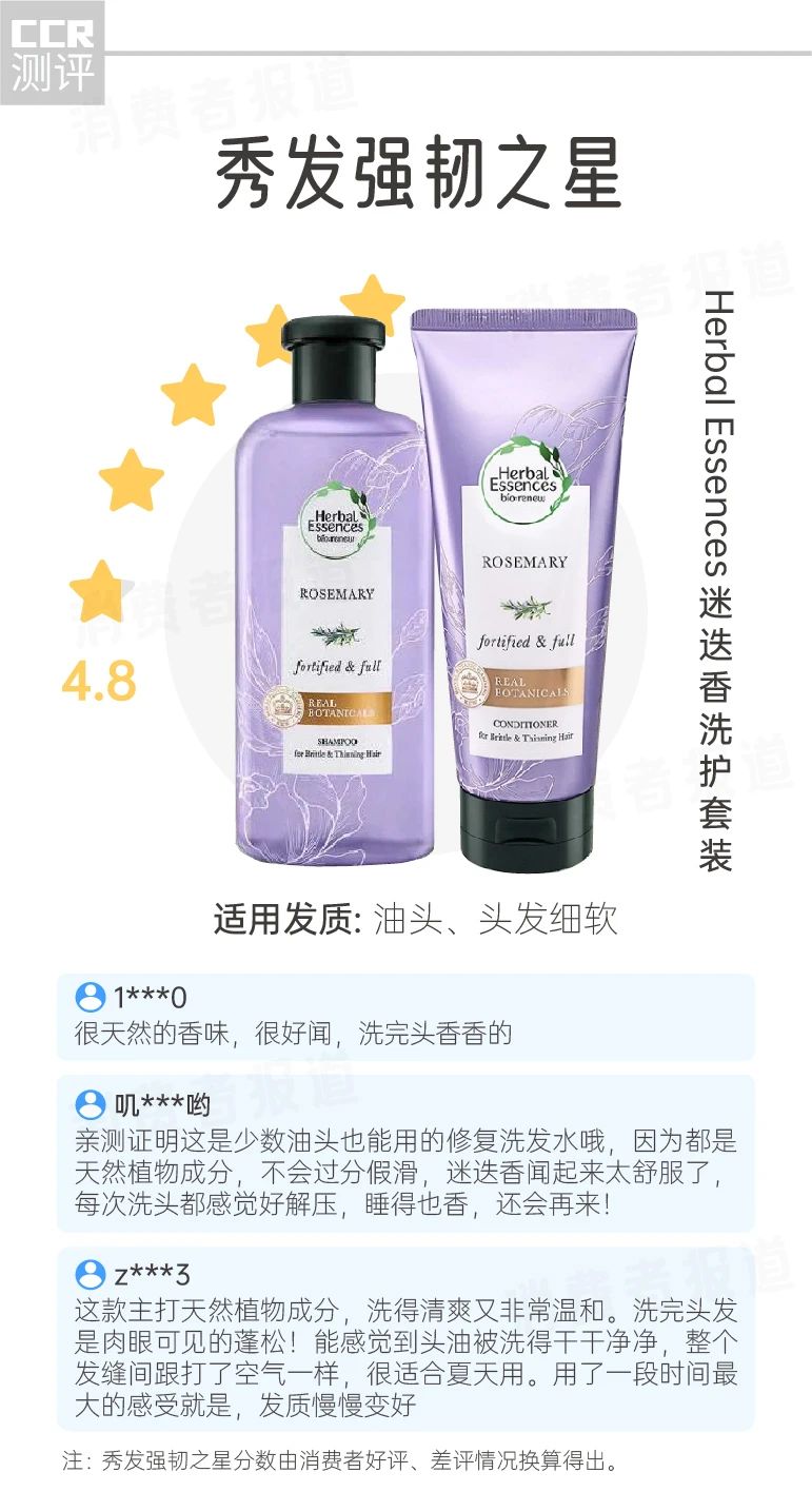 市面上这种强韧秀发的产品并不多,本次测评中的Herbal Essences迷迭香洗护套装就值得推荐。