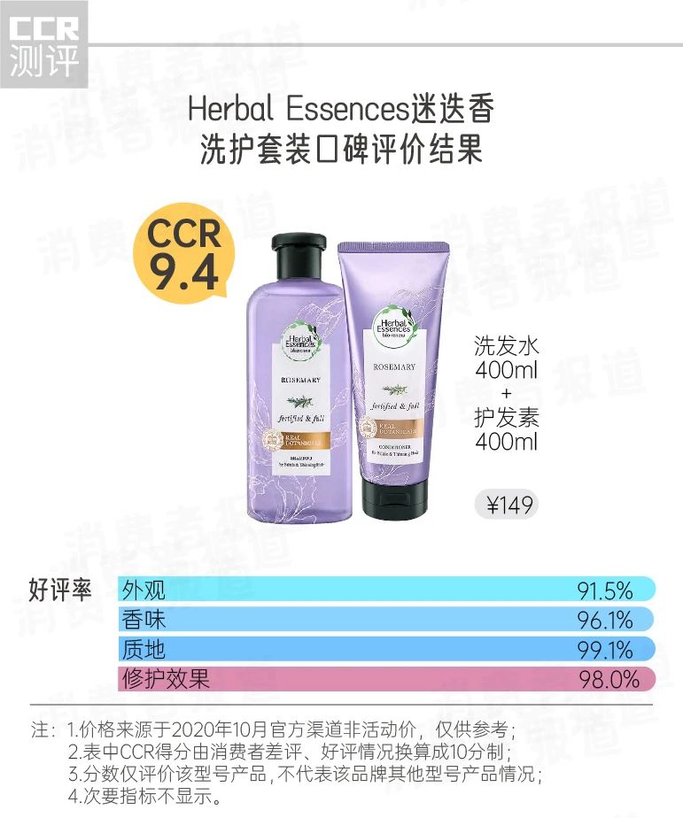 口碑数据结果显示,Herbal Essences迷迭香洗护套装CCR评分高达9.4分,在香味、质地、修护效果上都得到较高评价。
