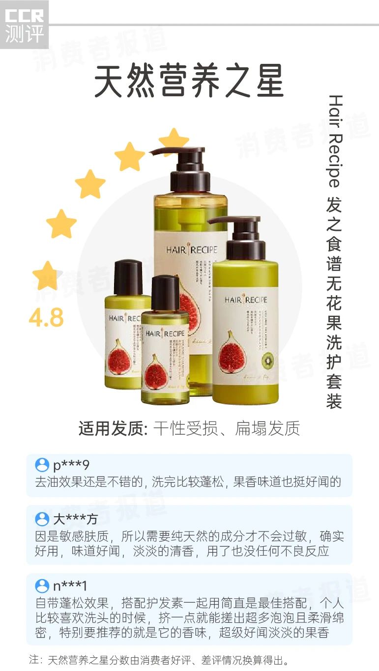 口碑评价结果显示,这款洗护套装CCR评分为9.4分,在质地、蓬松效果上都得到较高评价,另外外观、香味、泡沫也是5款洗护套装中评分最高的,各方面都表现均衡。