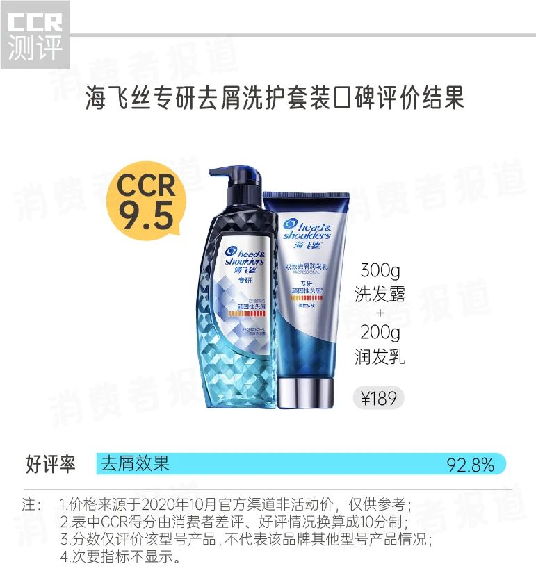 口碑评价结果显示,海飞丝专研去屑洗护套装CCR得分高达9.5分,在5款洗护套装中的“去屑效果”得到最多好评。评论涉及到“头屑”字眼的所有消费者中,93%都对其“去屑效果”较满意,而其余几款洗护套装的去屑效果好评率在70~89%之间。