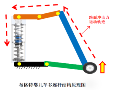 布格特(BURGT)婴儿推车避震器系统,通过多连杆(5连杆)结构将车架和座兜进行了柔性链接,当婴儿车行驶在颠簸路面时,路面所产生的冲击力先通过多连杆结构传递到液压避震器,再通过避震器的弹簧和阻尼器运动吸收能量,达到真正意义上的避震效果,从而真正有效地保护宝宝的头部、颈椎、腰榷、脊柱等部位的健康成长。