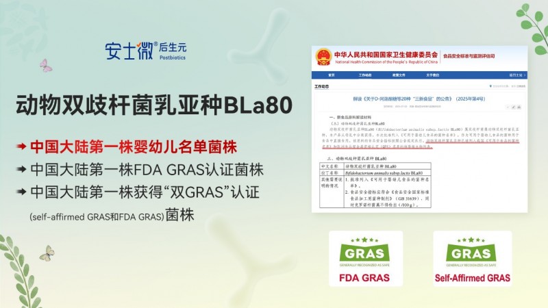 面对儿童暑期肠道困扰,安士微后生元“爽快”系列产品,正是基于后生元科技前沿,并依托一颗耀眼的“中国芯”—— 灭活动物双歧杆菌乳亚种BLa80。这个明星菌株于2025年7月创造了历史,同时获得中美双认证——被中国卫健委批准纳入《可用于婴幼儿食品的菌种名单》以及通过美国食品药品监督管理局(FDA)的GRAS(公认安全)认证,成为中国大陆首株获得此“双认证”的菌株,其卓越的安全性与功效获得了中美权威机构的一致背书。