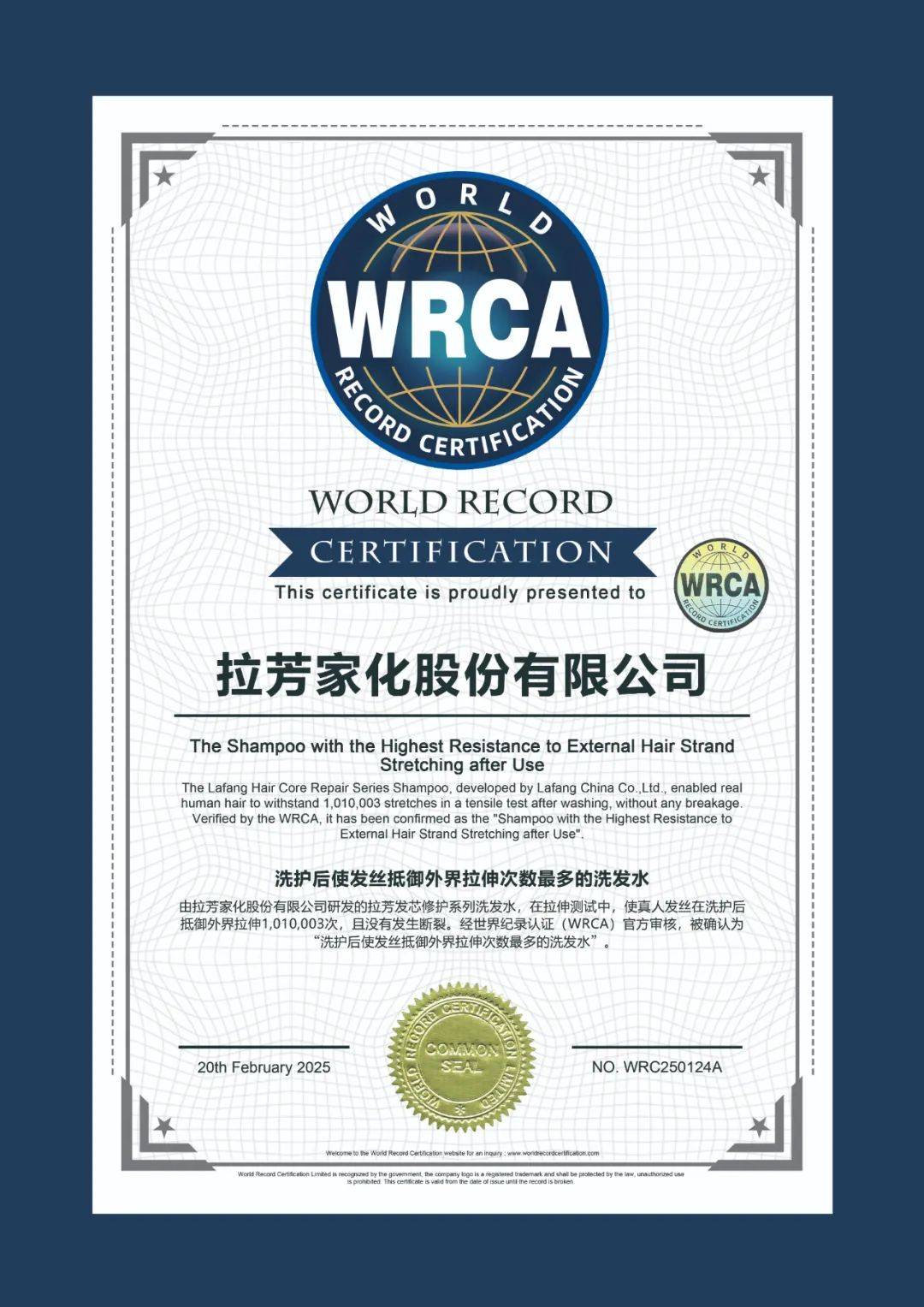 据了解,2025年2月,拉芳发芯修护洗发水获得WRCA世界纪录:洗护后使发丝抵御外界拉伸次数最多的洗发水。使用这款产品后,在实验室条件下发丝抵御外界拉伸次数实现了一万次到百万次以上的飞跃性提升,发芯强韧度大大提升。