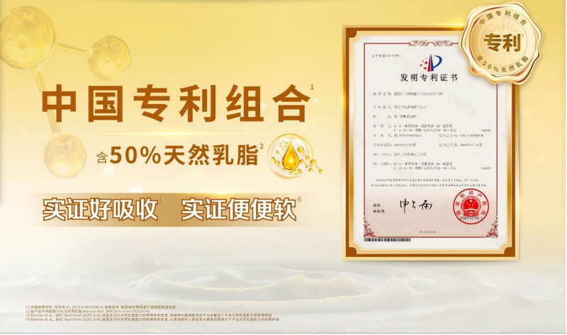 专利50%天然乳脂组合: 富含天然OPO类似结构脂,其吸收效率优于人工合成OPO,能有效促进关键营养吸收,减少硬便,近40种天然乳脂保护因子,温和呵护宝宝娇嫩肠道。