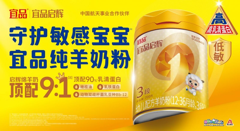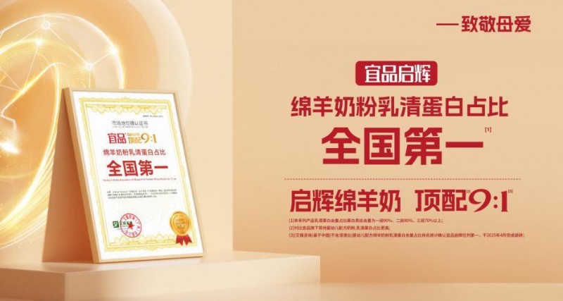 在此基础上,宜品启辉以9:1的乳酪蛋白配比(≥90%乳清蛋白含量)获得艾媒咨询授予的“绵羊奶粉高乳清全国占比第一”认证,这不仅是技术上的突破,更是对母乳初乳的极致致敬。