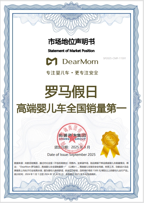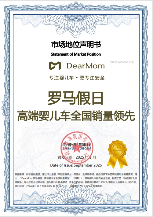2025年9月,尚普咨询集团向DearMom罗马假日颁发市场地位声明书。此次DearMom罗马假日荣获尚普咨询【DearMom罗马假日高端婴儿车全国销量第一】、【DearMom罗马假日高端婴儿车全国销量领先】市场地位声明,这一成绩不仅彰显了DearMom罗马假日在行业内的卓越地位,也为中国婴儿车市场的发展注入了强大动力。