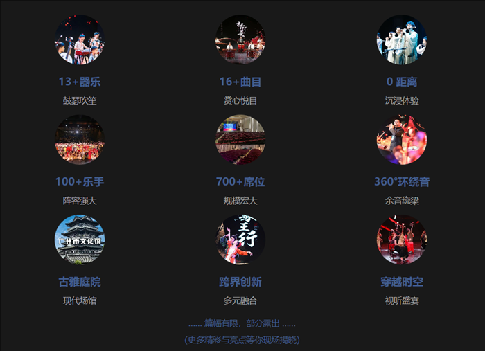 - 700+席位渐次亮起时,13+种器乐将在360°环绕音中苏醒,你与千年雅韵的距离,不过一个转身;